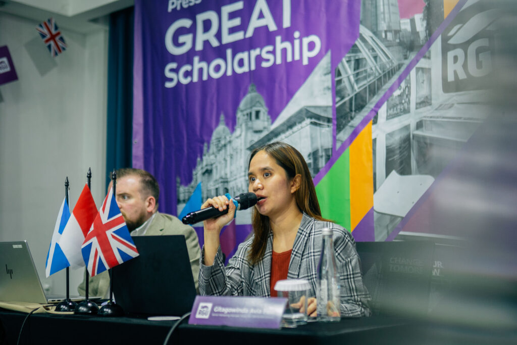 Memasuki sesi berikutnya, Gitagowinda Avia Feiz dari British Council Indonesia memaparkan GREAT Scholarship yang tersedia di RGU. Presentasi ini mencakup pilihan program studi, manfaat beasiswa bagi mahasiswa Indonesia, hingga gambaran proses pendaftaran.